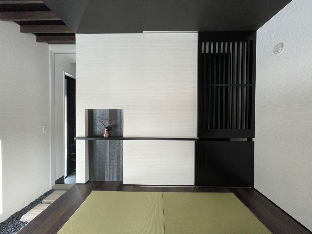 このにじり口の扉がスライドするためのレールを部屋のアクセントに見せるためのデザインは設計士さんが提案してくださいました😊