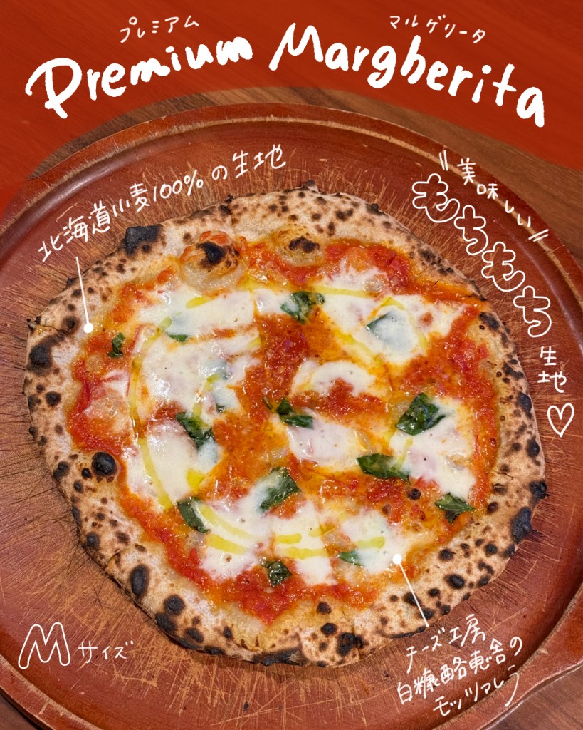 プレミアムマルゲリータには酪恵舎という美味しいチーズ屋さんのモッツァレラが使われていて、あまりの美味しさにMサイズにしたことを後悔しました。