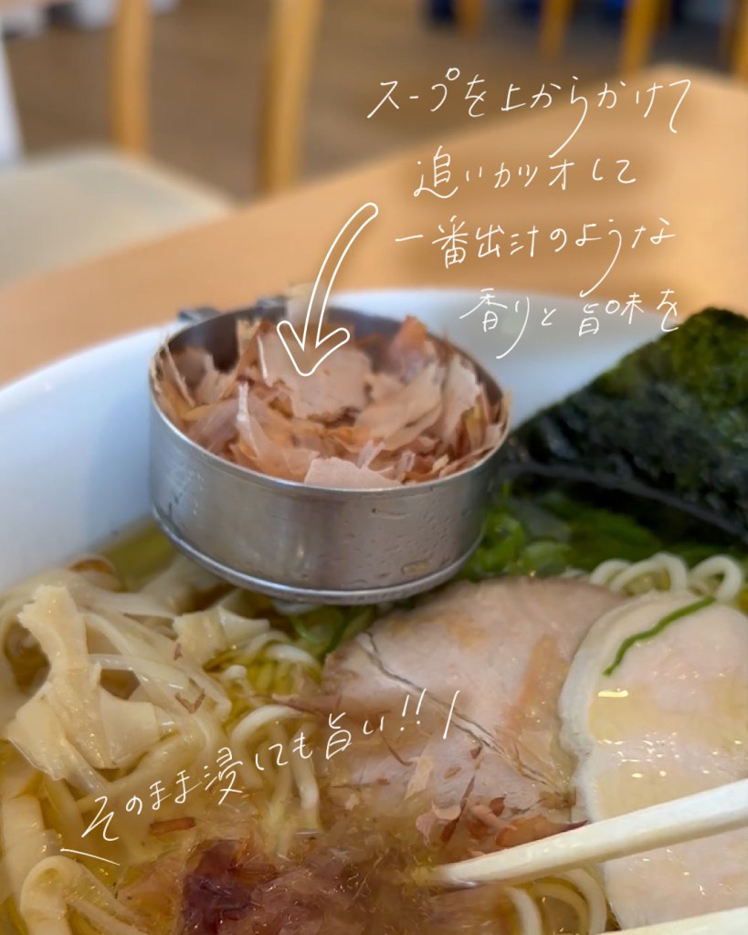 好きなタイミングでついてくる鰹節にスープをかけると1番出汁のような香りと味わいが楽しめます😊