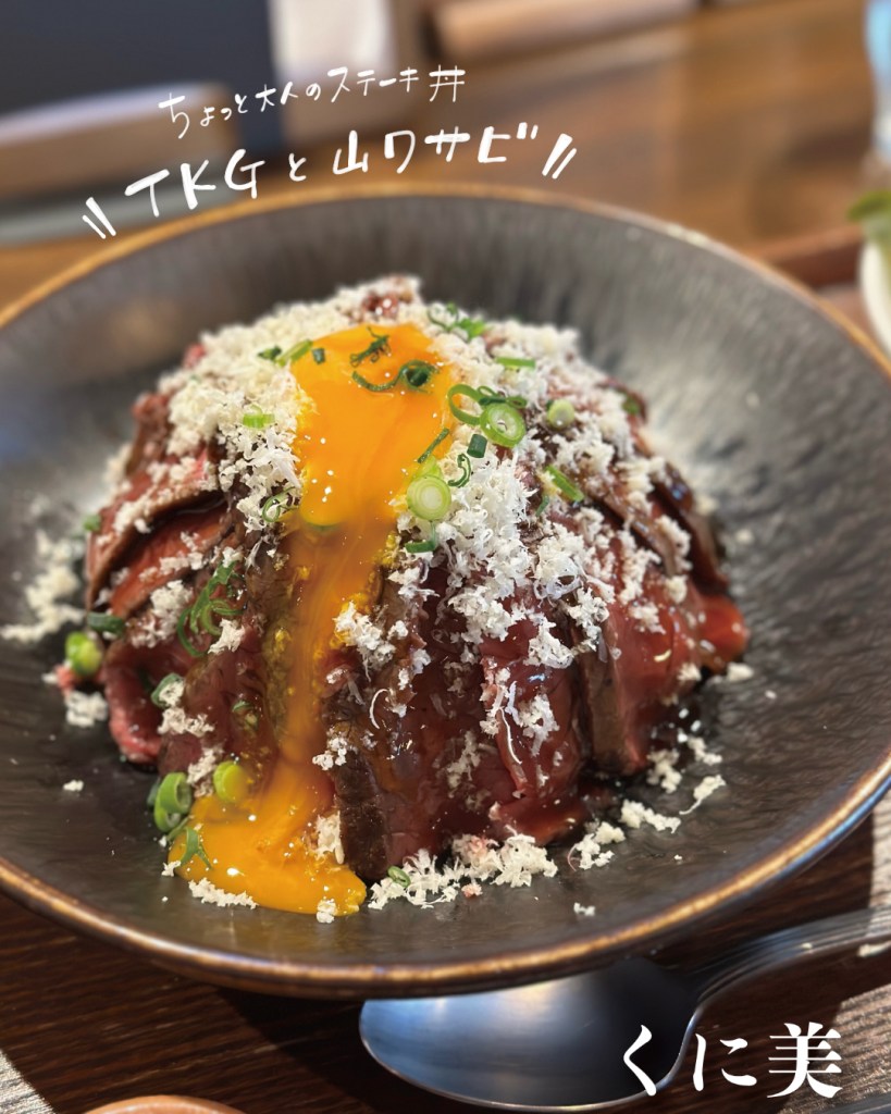 写真は、ステーキ丼TKG +山ワサビというものですが、ノーマルもあります。バジル味もあってそっちも美味しいよ♪