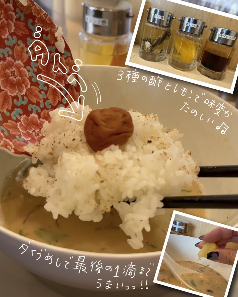 卓上の3種のお酢や梅干しで味変できて、濃厚ながらさっぱりと食べられるので、普段ご飯を頼まない私でももっとご飯欲しい!って思うほどでした^^