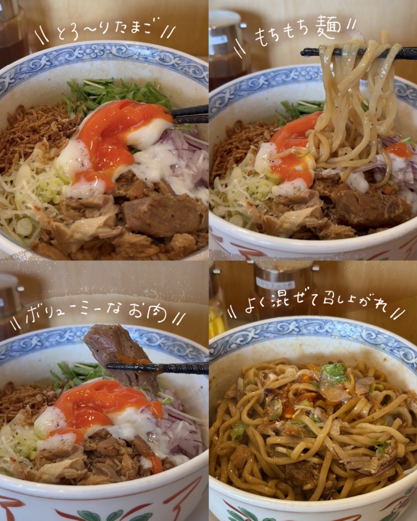 ガッツリモリモリ食べたい気分だってときは、こちらのまぜそばがおすすめ。お肉もゴロゴロ入って具沢山。