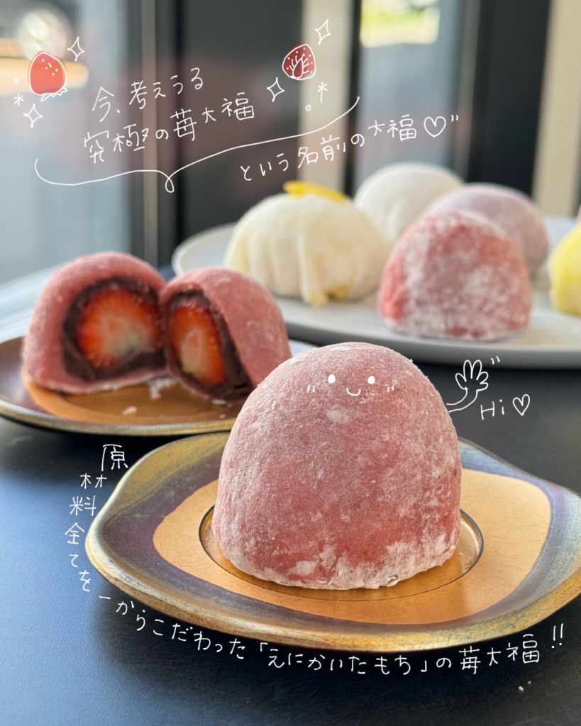 「今、考えうる究極の苺大福」という名前の、こだわりたっぷりの苺大福は北海道産きたゆきもちを蒸して苺ピューレを混ぜながらつき、さらにフリーズドライ苺も混ぜた苺好きにはたまらない一品🍓