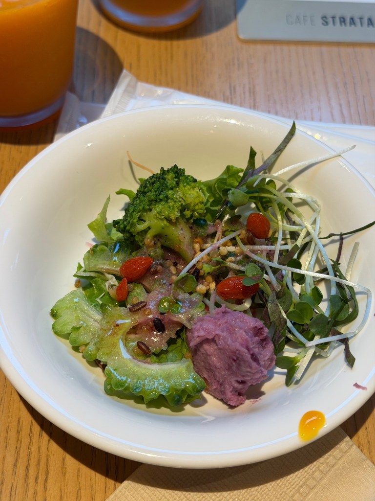 サラダにはゴーヤーや紅芋ポテトサラダなんかもあって、沖縄らしいドレッシングをかけて気分を盛り上げます♪